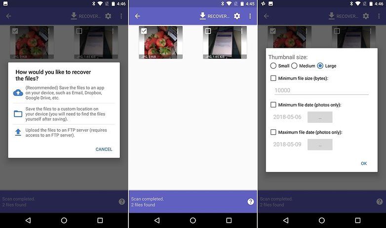 Se hai cancellato di recente le tue foto, DiskDigger dovrebbe essere in grado di trovarle e ti verrà data la possibilità di ripristinarle in una cartella sul tuo dispositivo o di eseguire il backup su un servizio cloud. All’inizio, non sembrava che DiskDigger potesse trovare le nostre foto nei test, ma un rapido giro nelle sue impostazioni e la deselezione del fattore minimo di dimensione del file hanno rivelato le nostre foto cancellate. A questo punto dovremmo anche notare che se vuoi recuperare le tue foto, avrai bisogno della versione Pro dell’app.