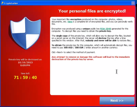 CryptoLocker è un nuovo, pericoloso ransomware (malware che blocca il PC in cambio di soldi o informazioni) capace di provocare un danno per molti inestimabile: prende in ostaggio i nostri documenti personali, con promessa di rilasciarli dopo che sarà stato pagato un riscatto di 300 dollari, 2 bitcoin o una cifra simile in altra valuta. In caso contrario, dopo 72 ore la chiave di decriptazione sarà distrutta dagli hacker e con lei ogni possibilità di riavere i nostri documenti.