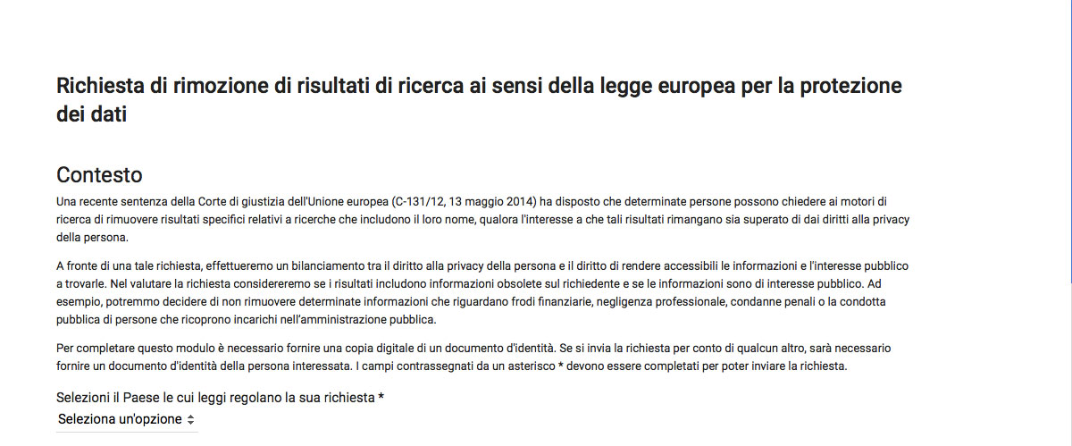 Prima di tutto ci si deve collegare a questo indirizzo messo a disposizione da Google. Il primo paragrafo di questo modulo di richiesta spiega brevemente quello che state per fare e per richiedere. Sarà richiesto il documento di identità di chi fa la richiesta, quindi preparate una fotocopia.
