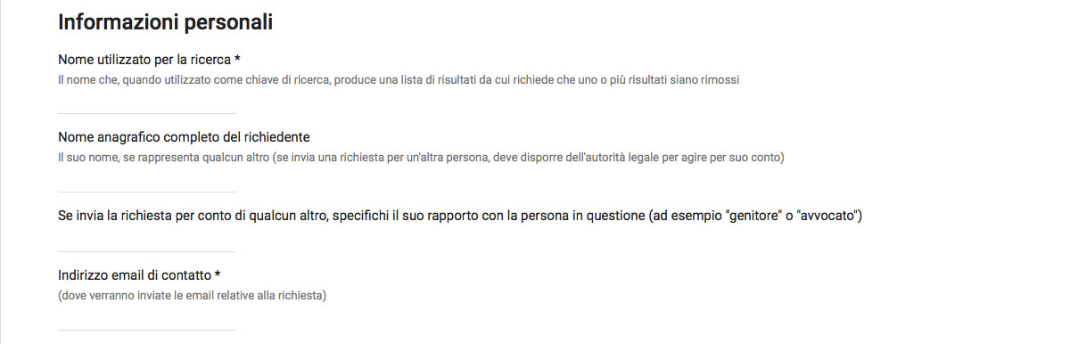 Il passo successivo riguarda l’inserimento dei dati personali. Inserite nel primo campo il nome e il cognome della personalità che vuole esercitare il diritto all’oblio (quindi, della persona di cui si vogliono eliminare i dati). Se la richiesta è effettuata da un rappresentante della persona in questione, si deve compilare anche il secondo campo e specificare il rapporto con la persona (“genitore, avvocato”).