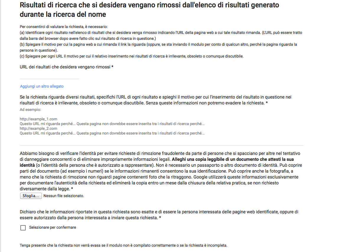 Google, come anticipato, vi chiede di verificare l’identità, per evitare richieste di rimozione fraudolente da parte di persone che si spacciano per altre. Si deve quindi allegare una copia leggibile del documento di identità che attesti la vera identità di chi sta facendo la richiesta (o della persona autorizzata a fare la richiesta).