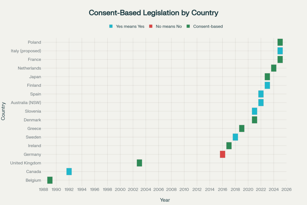 La Svezia, adottando questo principio, è diventata solamente il decimo stato in Europa a disancorare la definizione di stupro dalla forza fisica, con Amnesty International che ha definito la posizione predominante degli altri Stati membri come basata su una definizione “obsoleta”.5 Questo cambiamento legislativo è stato fortemente influenzato dalla pressione sociale e dalla campagna globale #MeToo.6