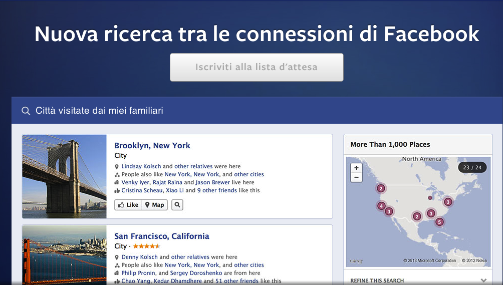 Facebook Graph Search è il nuovo potentissimo tool di ricerca presentato quest’anno da Mark Zukerberg e ora in arrivo anche in Italia. Di cosa si tratta esattamente? Graph Search è un motore di ricerca semantico, che permetterà a tutti gli iscritti al social network di fare ricerche incrociate tra persone, luoghi, interessi. Non funziona semplicemente tramite parole chiave, ma le sue potenzialità sono sfruttate al meglio se poniamo le nostre domande proprio come nella vita di tutti i giorni. Ad esempio, potremo digitare direttamente nella casella di ricerca: