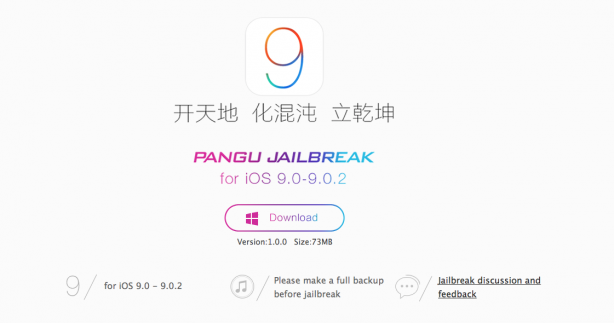 - Per effettuare un nuovo jailbreak bisogna innanzitutto procurarsi Pangu 1.1.0 per Windows: attraverso il sito ufficiale, è possibile scaricare il file eseguibile .exe del tool per il jailbreak (dal peso di circa 73 Mb). La procedura funziona con tutti gli iPhone successivi al 4S, iPad 2 e successivi (incluse le versioni Mini) e iPod Touch 5-6G, con sistemi operativi iOS 9.0, 9.0.1 e 9.0.2 (non funziona, quindi, con iOS 8 e precedenti).