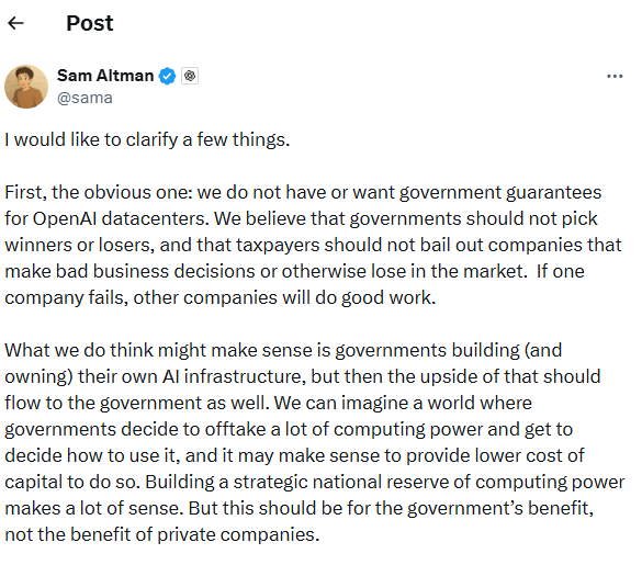 In mezzo alle polemiche sui costi dei data-center, Altman ha affermato su X che OpenAI non ha né cerca garanzie statali per ottenere finanziamenti.
