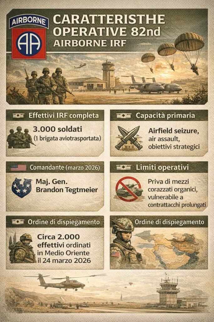 La componente centrale della forza di proiezione rapida terrestre è l’Immediate Response Force (IRF) della 82nd Airborne Division, con sede a Fort Bragg (Fort Liberty), North Carolina. Questa unità costituisce la Global Response Force dell’esercito USA e rappresenta il primo escalation step per operazioni di terra in Iran.