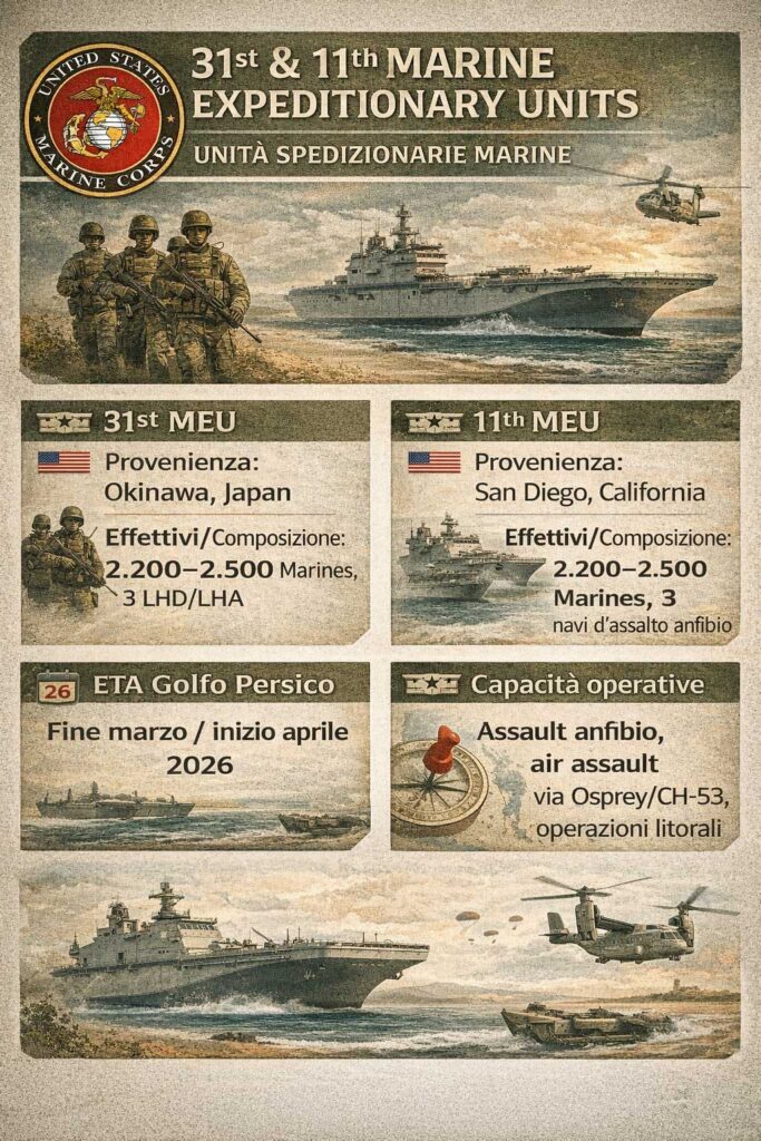 La 31st MEU, basata permanentemente a Okinawa e parte della III Marine Expeditionary Force, è attesa nell’area di responsabilità del Central Command entro fine marzo 2026, mentre l’11th MEU (I MEF, San Diego) potrebbe arrivare entro alcune settimane. Entrambe le MEU viaggiano su Amphibious Ready Groups composte tipicamente da tre navi principali: Landing Helicopter Dock (LHD) o Landing Helicopter Assault (LHA) come la USS Tripoli e la USS Boxer, più navi da trasporto anfibio e dock (LPD, LSD).