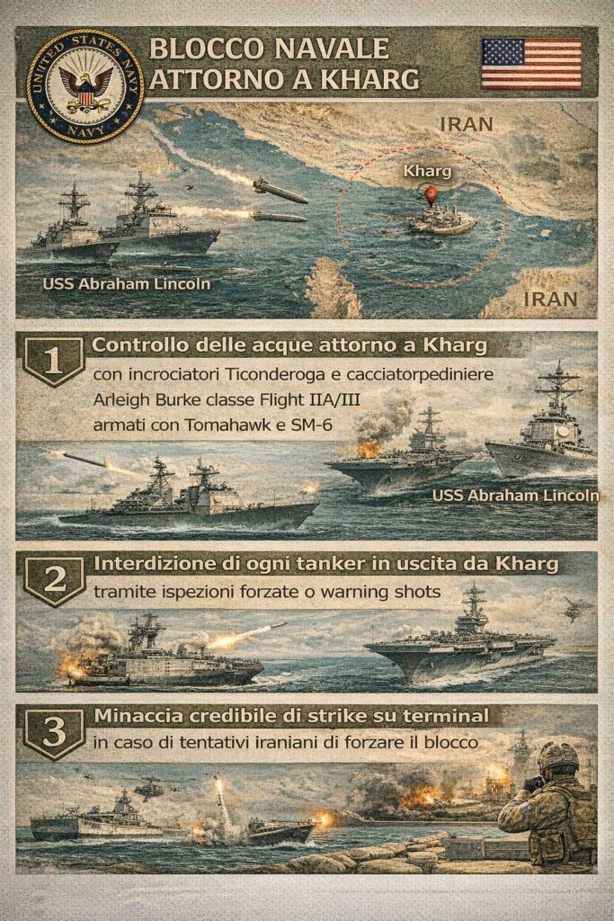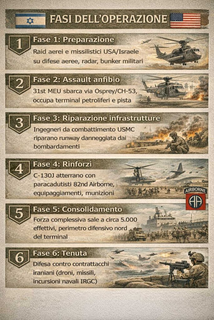 L’obiettivo strategico di questa operazione sarebbe duplice: (a) rompere il blocco iraniano sullo Stretto di Hormuz togliendo a Teheran la sua principale leva economica (export petrolifero), costringendo l’Iran a riaprire lo Stretto per evitare il collasso economico totale; (b) creare una testa di ponte controllata dagli USA che obblighi l’Iran a disperdere forze militari lontano dai fronti missilistici e navali principali, alleggerendo la pressione su Israele e sulle basi USA in regione.