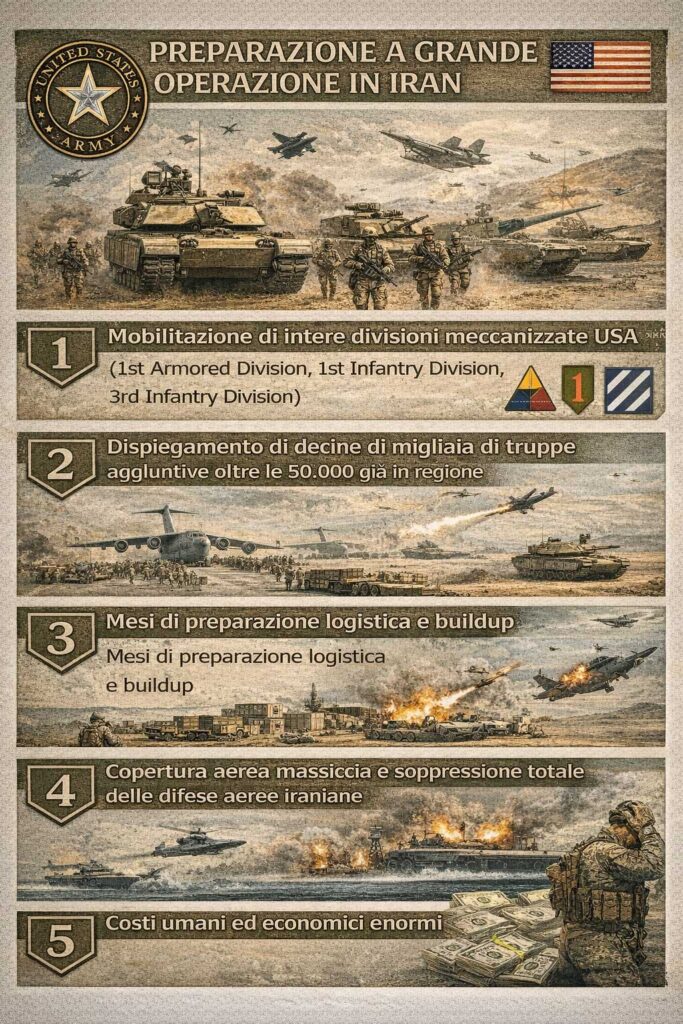 - Invasione terrestre massiccia dell’Iran (bassa plausibilità a breve termine): Questo scenario richiederebbe mesi di ulteriore buildup, mobilitazione di divisioni meccanizzate, e costi umani ed economici che l’amministrazione Trump non sembra disposta a sostenere al momento. Più probabile come “worst case scenario” mantenuto come deterrente.