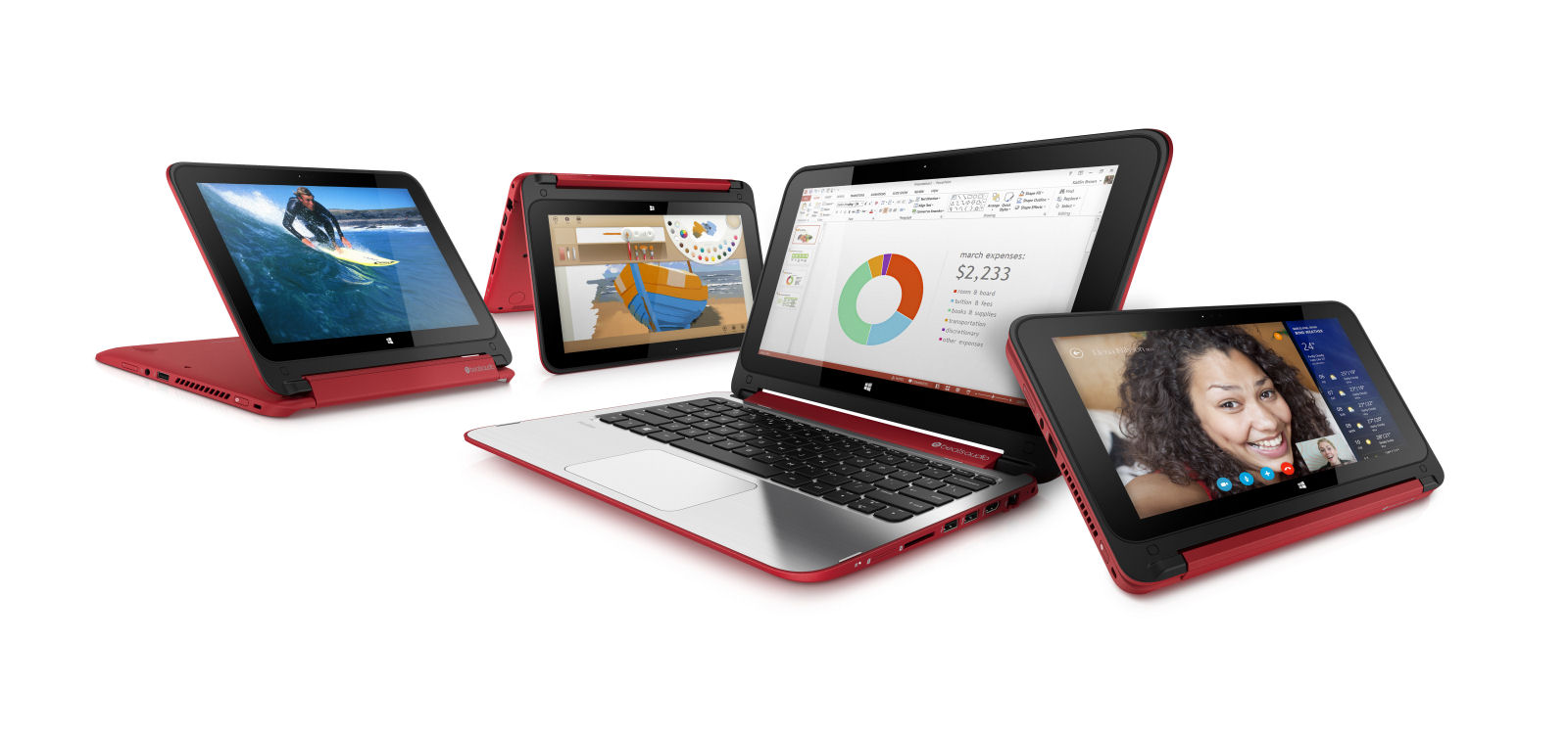 I colori disponibili sono il classico silver e un moderno rosso, che rivestono la parte esterna della macchina con plastiche opache che lasciano posto, attorno allo schermo, ad un’elegante cornice nera lucida. Per comprendere le ragioni del nome Hp Pavilion x360 è sufficiente aprire lo schermo e portarlo a fine corsa: da normale laptop, lo schermo può ruotare fino ad appoggiarsi sulla parte posteriore dello chassis, ruotando appunto di circa 360°.