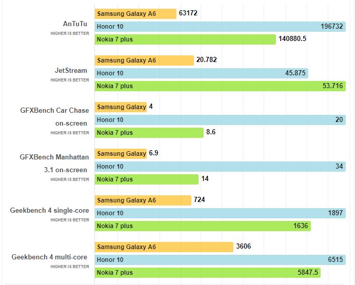 I benckmark sono piuttosto impietosi: confrontato con diversi prodotti simili di altre marche e della stessa fascia, Samsung Galaxy A6 è sempre sotto. In particolare Honor 10, che spulciando le offerte si trova a €30/40 in più rispetto al Samsung Galaxy A6, lo surclassa sotto ogni aspetto.