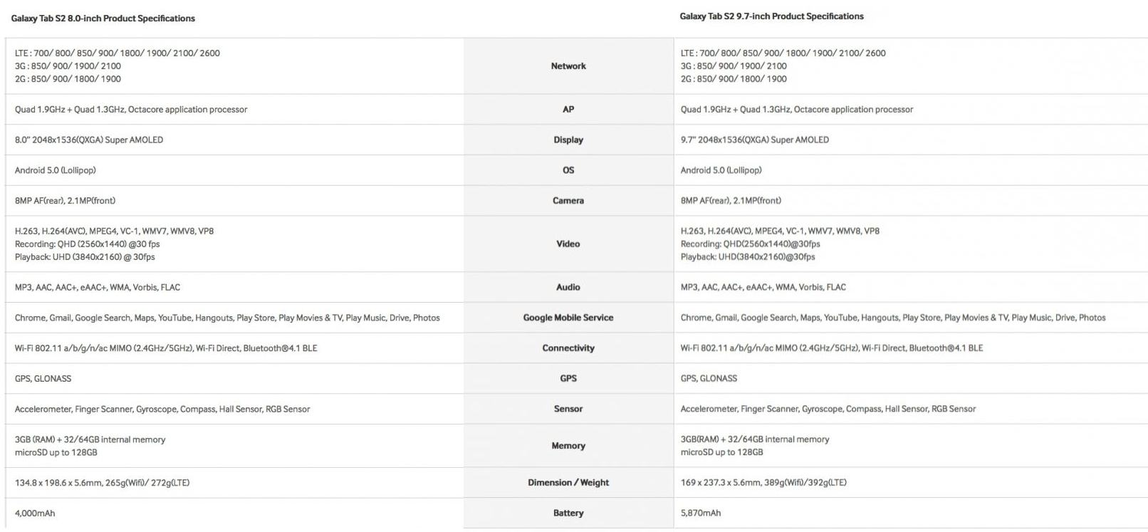 I dati tecnici sono uguali per entrambe le versioni. Il sistema operativo è Android 5.0 Lollipop e interfaccia personalizzata TouchWiz. Il processore è un Octa core Exynos 5433 (quattro Cortex-A57 da 1.9GHz e quattro Cortex-A53 da 1.3GHz) con 3 GB di RAM e memoria interna da 32 a 64 GB, estendibile con scheda microSD fino a 128 GB. L’unica differenza riguarda la batteria. Il Galaxy Tab S2 8.0 ne monta una da 4000 mAh mentre il Galaxy Tab S2 9.7 ne offre una più potente 5870 mAh.