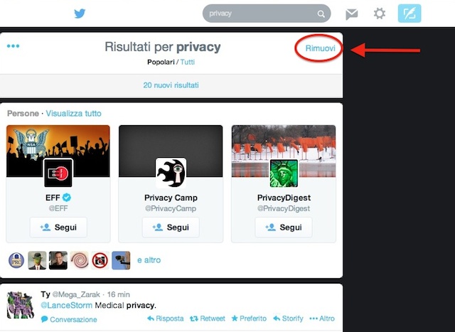 Possiamo eliminare una ricerca salvata anche dalla pagina stessa dei risultati salvati per quella ricerca, facendo clic sulla voce Rimuovi.