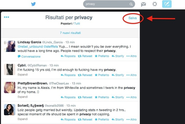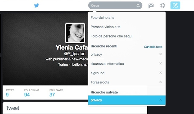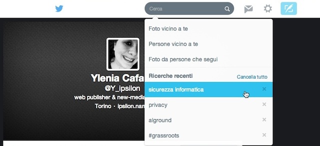 Quando cerchiamo un’informazione su Twitter, eseguendo una ricerca per termine generico, per hashtag o per nome utente, le parole immesse sono automaticamente salvate. Possiamo visualizzarle nella sezione Ricerche recenti, all’interno del pannello che si apre selezionando la casella Cerca.