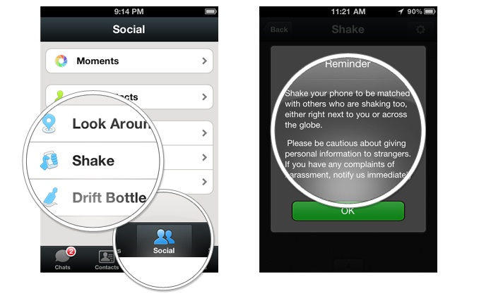“Momenti” di WeChat, per condividere le proprie immagini, e altre funzioni social - Agita: è la funzione che permette di entrare in contatto con sconosciuti che hanno agitato a loro volta il proprio smartphone. La funzione si basa sulla geolocalizzazione delle persone che la utilizzano, previa autorizzazione. L’utente, agitando il proprio telefono, si rende rilevabile dall’app, che suggerisce il suo profilo ad altre persone, in tutto il mondo, che stanno adoperando la stessa funzione.Contemporaneamente, viene proposta all’utente stesso una lista di persone, che può decidere di contattare attraverso l’opzione Saluti. Se la prima lista suggerita non lo soddisfa, può continuare ad agitare il telefono vedendo continuamente nuovi risultati, tra i quali può trovare persone della stessa città come di un altro continente.