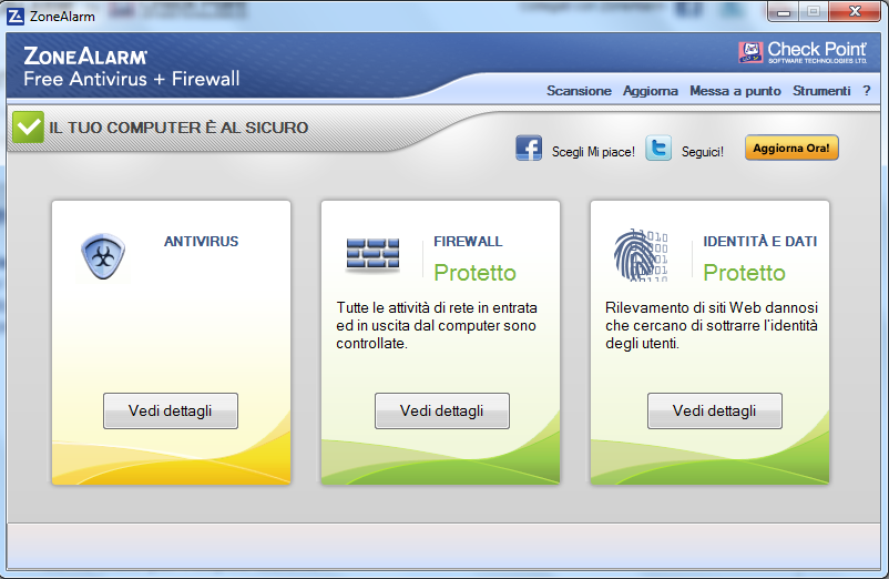 ZoneAlarm Free Antivirus + Firewall 2013 propone in un’unica soluzione due prodotti che, insieme, garantiscono una completa sicurezza del PC durante la navigazione online. Utilizzare l’antivirus e il firewall di ZoneAlarm in questa versione integrata, anziché installare i due software separatamente, permette di ottenere un solo prodotto più leggero, più semplice da utilizzare e che attraverso la stessa interfaccia consente di gestire più livelli di sicurezza. Questi diversi livelli sono immediatamente visibili nel pannello principale del  programma: