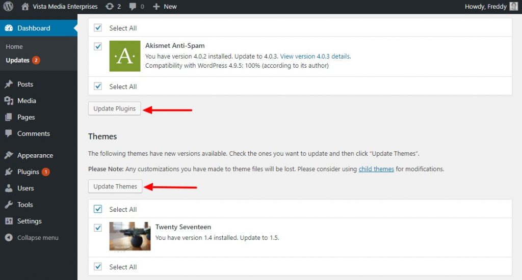 Dall’immagine qui sopra, puoi vedere quanti problemi di sicurezza e bug vengono corretti da ogni release. A questo punto, la tua piattaforma WordPress è aggiornata. Ora procedi e aggiorna i tuoi temi e plugin.