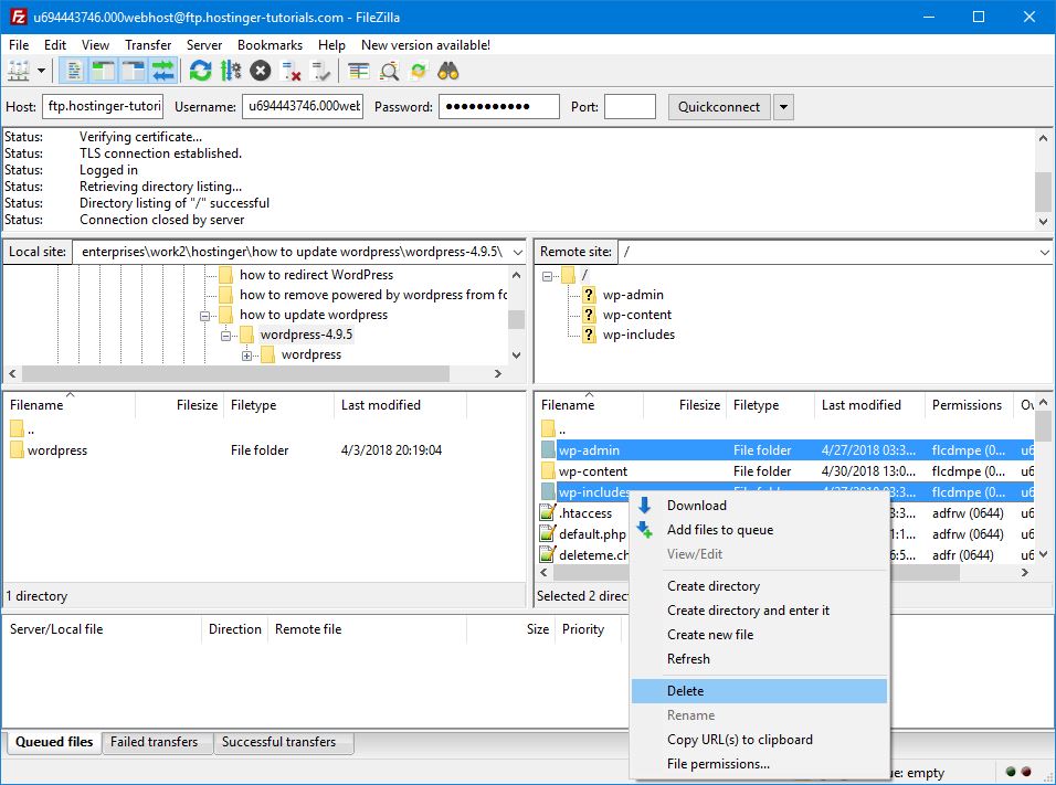 Elimina le cartelle wp-admin e wp-includes esistenti sul tuo host Web. Se si sta utilizzando FileZilla, basta selezionare le cartelle, fare clic destro e scegliere Elimina: