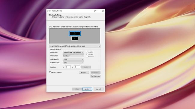 Con UltraMon, è possibile utilizzare una singola immagine per l’intero desktop o diverse immagini per ciascun monitor. È inoltre possibile creare sfondi a colori sfumati che si estendono su due monitor.