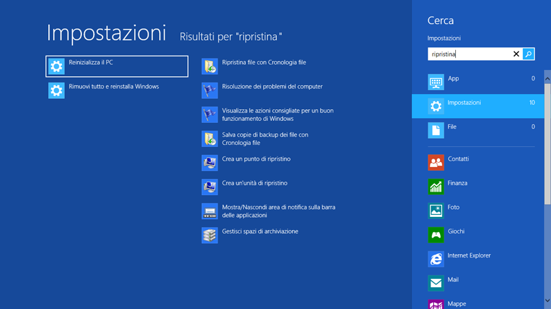 • Aprire la schermata Start e cercare la voce Ripristino;