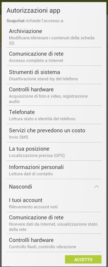 La lunga lista di permessi richiesti da Snapchat