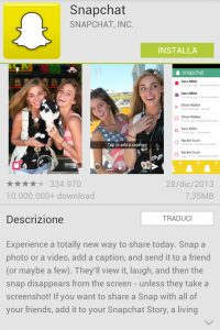 A partire dall’installazione, l’applicazione chiede molto all’utente in termini di permessi. Per poter iniziare a utilizzare Snapchat è necessario consentire al programma di modificare/eliminare i contenuti sulla scheda SD, garantire l’accesso completo a internet, l’acquisizione in qualsiasi momento di foto e video attraverso la telecamera, l’accesso alle telefonate, la lettura dello stato e dell’identità del telefono (incluso numero personale, numero di serie del dispositivo, numero a cui è collegata la chiamata), permettere l’invio di SMS a pagamento, la localizzazione GPS  (con possibilità di individuare la propria posizione), la lettura dei dati di contatto (inclusi numeri e indirizzi della rubrica) e degli account memorizzati sul telefono.