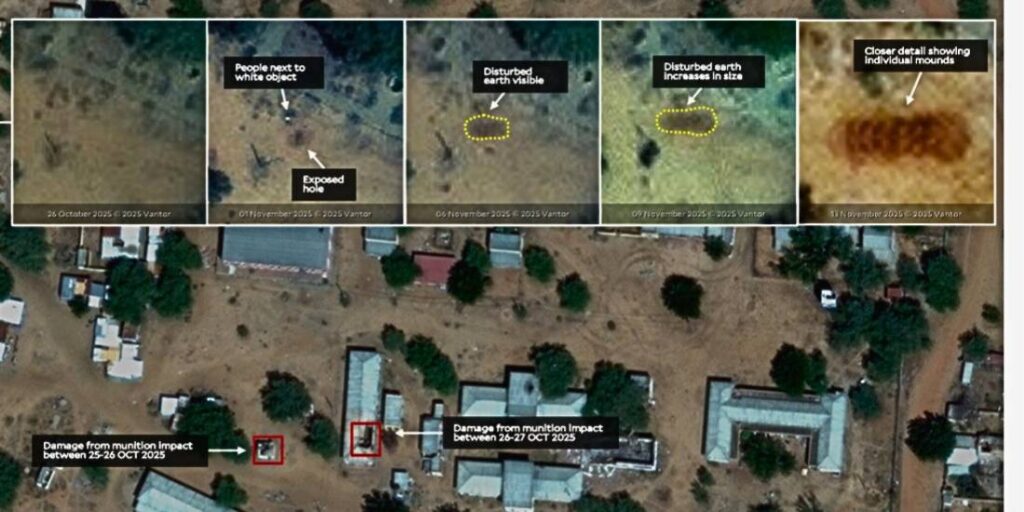 Le nuove analisi satellitari indipendenti mostrano una realtà devastante: El Fasher non è semplicemente caduta, è stata svuotata. Le immagini del Yale Humanitarian Research Lab indicano piles di corpi raggruppati, mercati completamente deserti, animali scomparsi e una rete di fosse e inceneritori recentemente scavati ai margini della città.